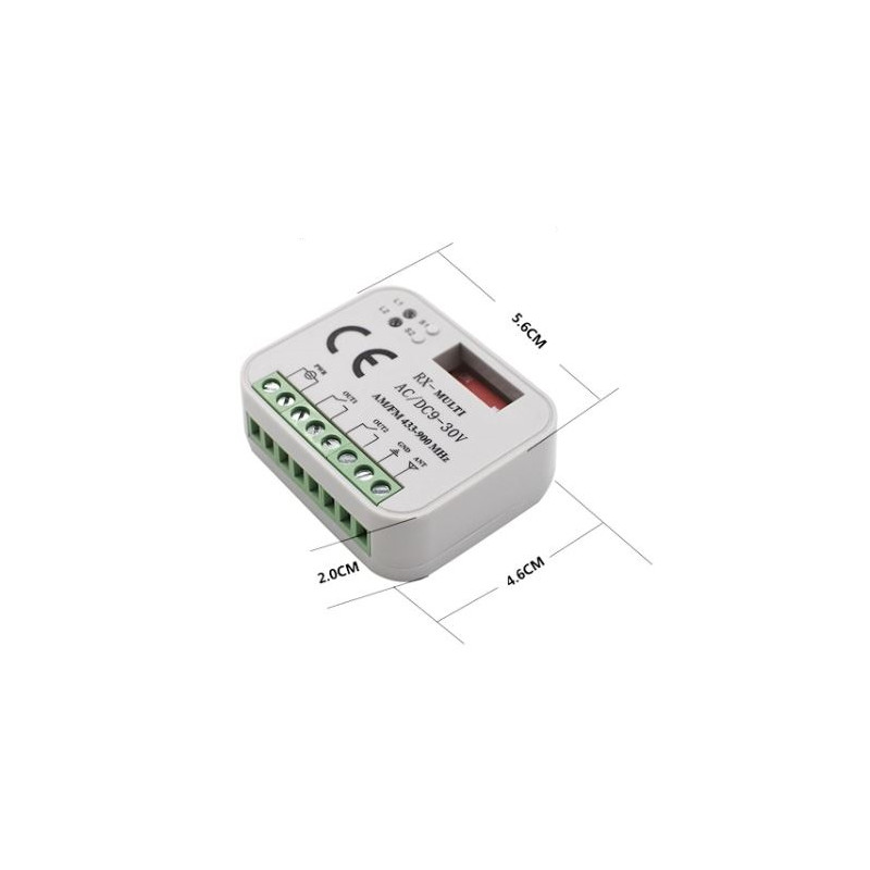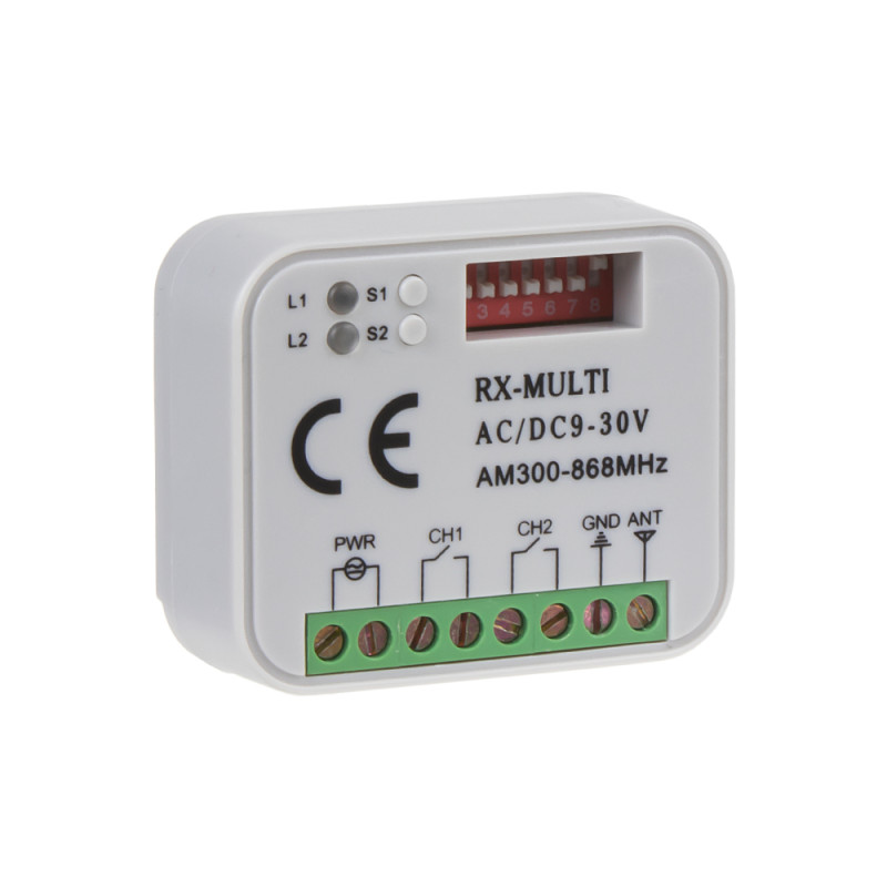 Externí dvoukanálový univerzální přijímač dálkového ovládání spolupracující s celou řadou dálkových ovladačů různých výrobců pracujících na frekvenci 300-868 MHz s pevným i plovoucím kódem.