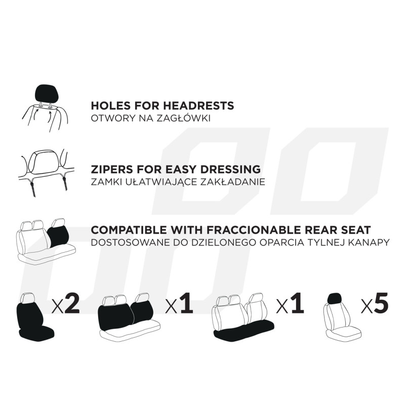 ► SÚPRAVA OBSAHUJE:* 2 samostatné poťahy na predné sedadlá* 1 poťah na sedadlo zadného ľavicového sedadla* 1 poťah na operadlo zadného ľavicového sedadla* 5 poťahov na opierky hlavy* montážna súprava