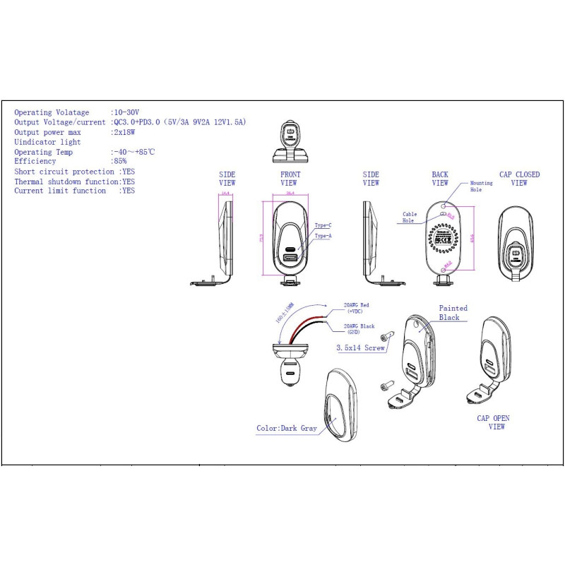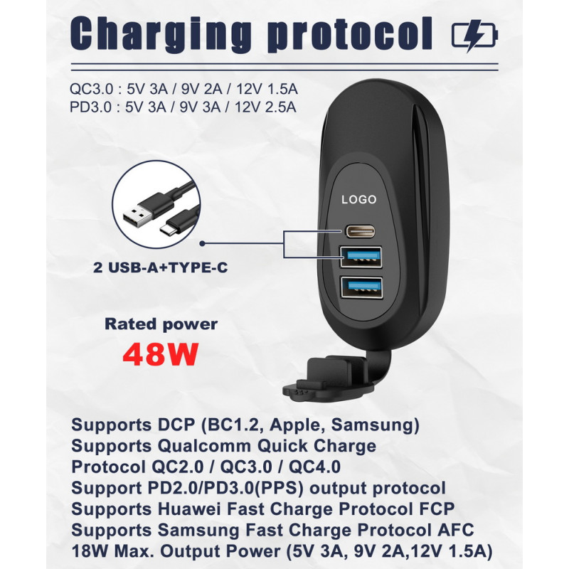 • podpora protokolu: DCP (BC1.2, Apple, Samsung), Qualcomm Quick Charge QC2.0 / QC3.0, PD2.0 / PD3.0(PPS), Huawei Fast Charge Protocol FCP, Samsung Fast Charge Protocol AFC