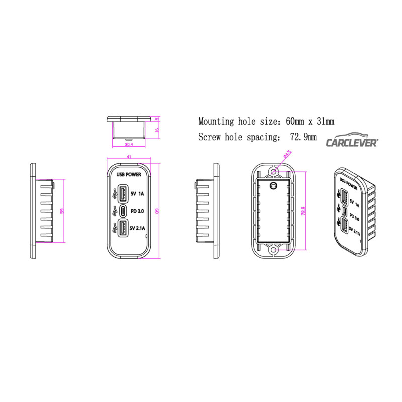 USB nabíječka do panelu, QC + USB-C, s krytkou proti prachu a vlhkosti.
