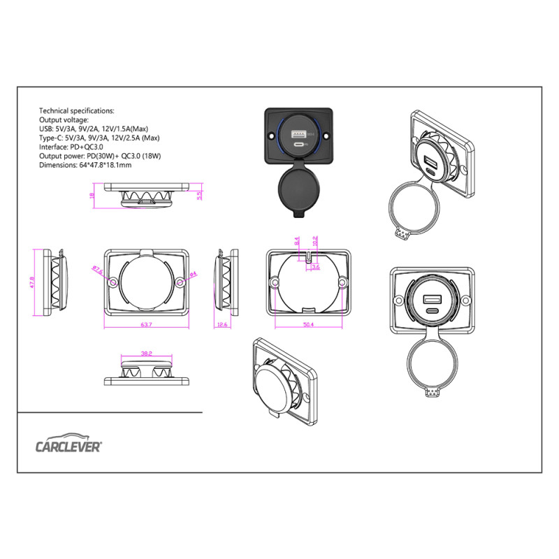3x USB nabíječka (Quickcharge QC 3.0) do panelu, se spínačem a krytkou proti prachu a vlhkosti, modré podsvícení.