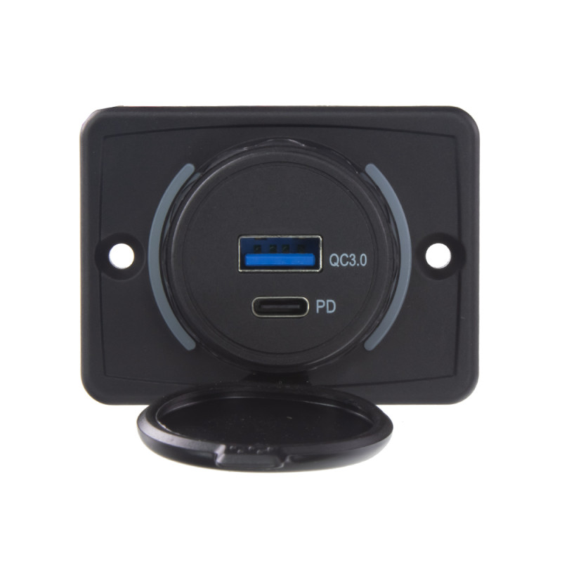 USB nabíječka do panelu, QC + USB-C, s krytkou proti prachu a vlhkosti.