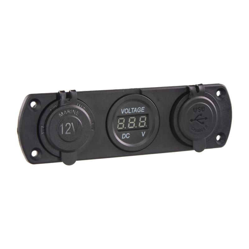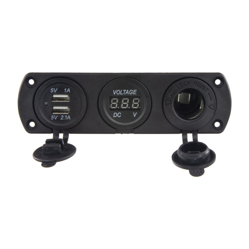 Trojitá zásuvka do panelu s voltmetrem, CL, 2x USB-A (3,1 A) nabíječka voděodolná.