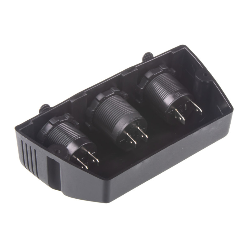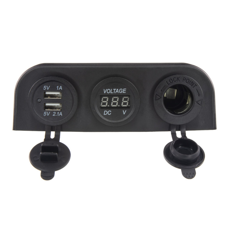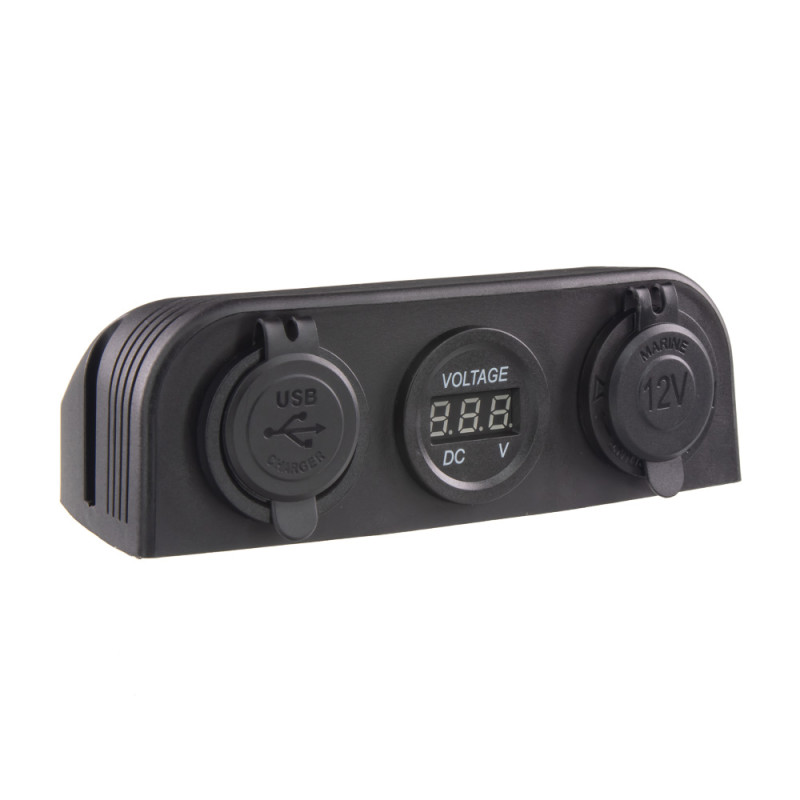 Trojitá zásuvka s panelem pro samostatnou montáž s voltmetrem, CL, 2x USB-A (3,1 A) nabíječka voděodolná.