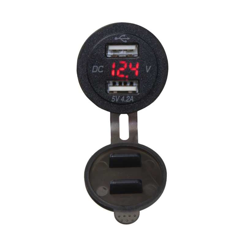 2x USB nabíječka s voltmetrem do panelu, s krytkou proti prachu a vlhkosti, červený LED displej.