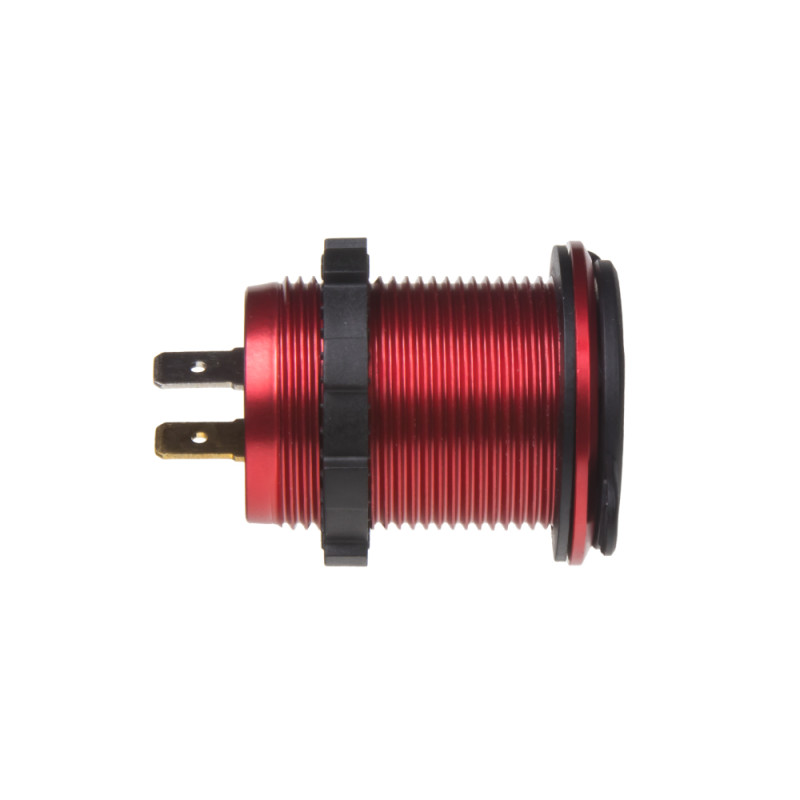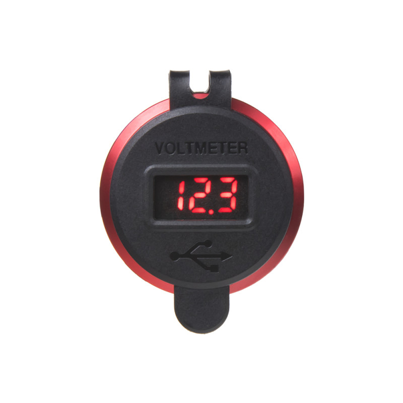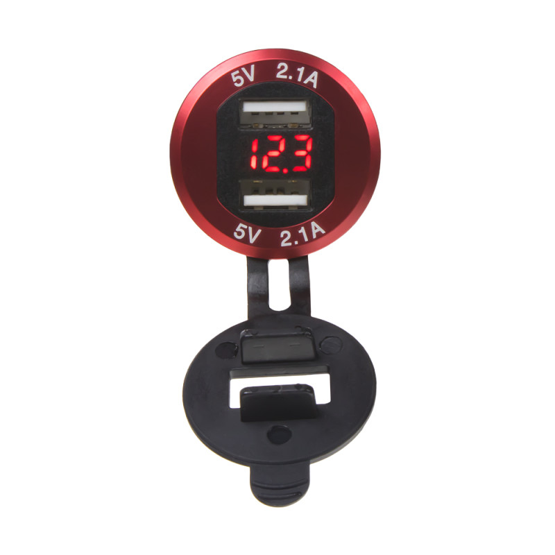 2x USB nabíječka s voltmetrem, hliníková do panelu, s krytkou proti prachu a vlhkosti, červená.