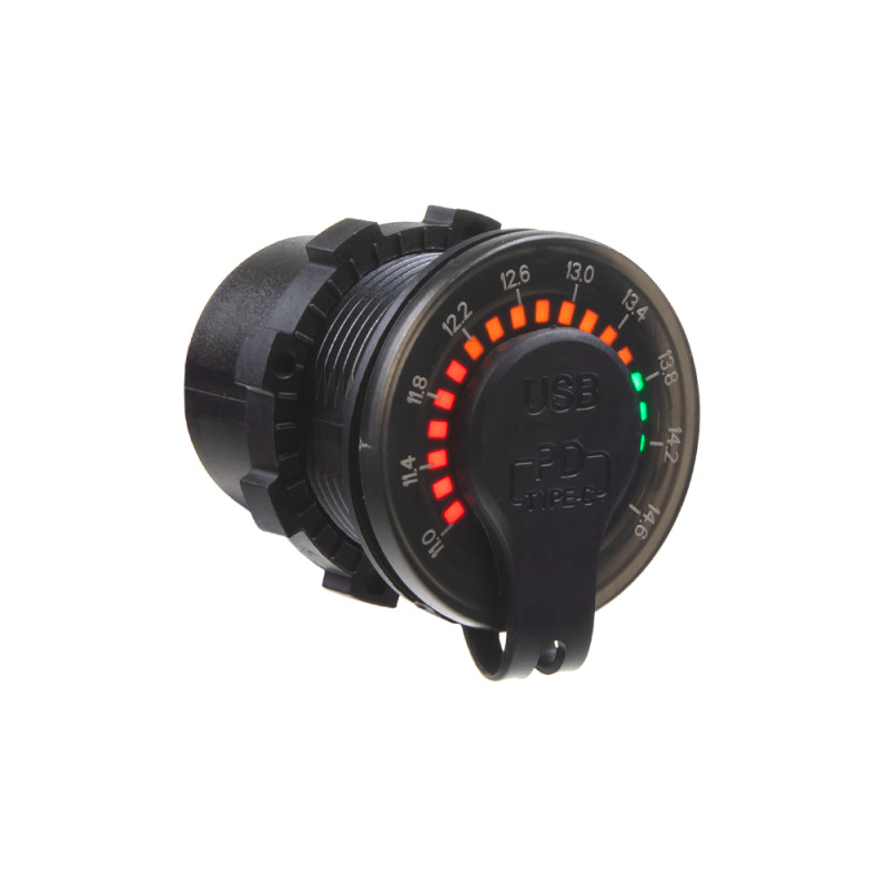 USB nabíječka do panelu, QC3.0 + USB-C, s voltmetrem a s krytkou proti prachu a vlhkosti.