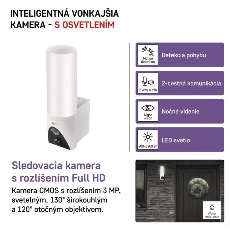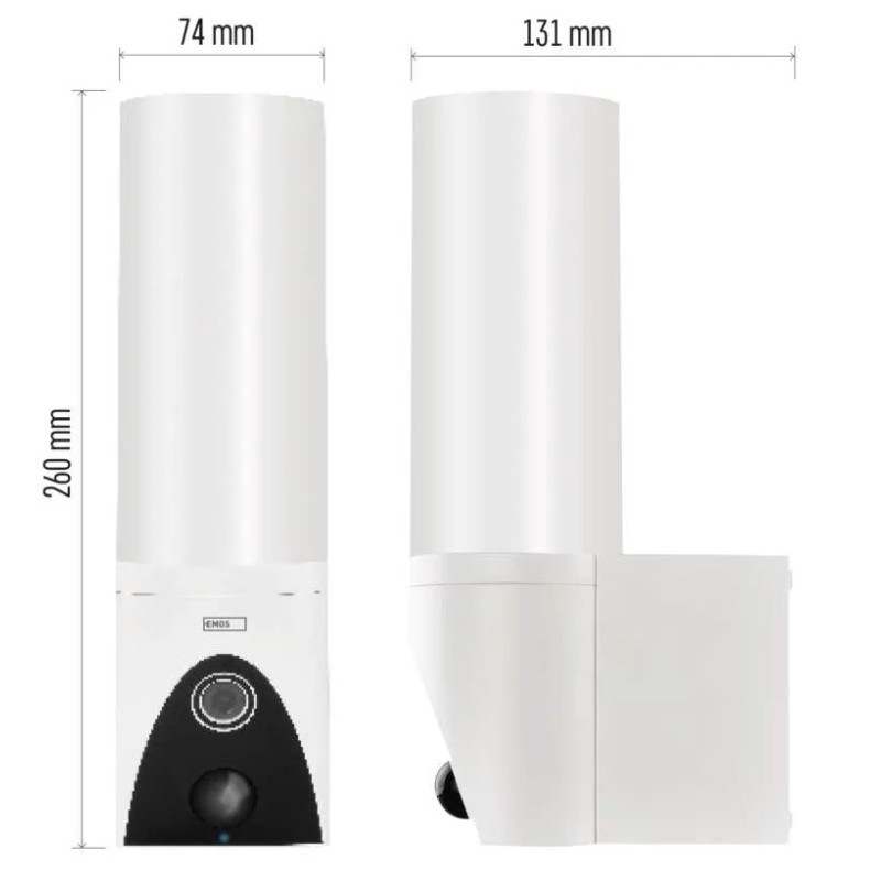 ► Kamera má širokouhlý objektív, rozlíšenie Full HD a nočné videnie a získate dokonalý a nestranný prehľad o dianí v jej okolí. Po aktivácii vás prostredníctvom mobilného telefónu upozorní na zaznamenaný pohyb v zornom poli objektívu a nahráva na kartu SD alebo do cloudového úložiska► Automatické ukladanie obrázkov: áno► Montáž: na stenu + na postavenie► Napájanie kamery: AC 100-240 V► Nastavenie oblasti detekcie: áno► Nočné videnie: áno► Maximálny dosvit nočného videnia: 10 metrov► Snímací prvok kamery: 1/2,9‘‘ 2 Megapixel CMOS► Farba: biela► Rozmery: šírka 74 mm, hĺbka 131 mm, výška 260 mm► Uhol záberu kamery: 130°► Krytie: IP65► Rozlíšenie kamery: 1 920 × 1 080► Detekcia pohybu: áno► Detekcia zvuku: nie► IR CUT: nie► Siréna: nie► Podporované OS: Android, iOS► Kompatibilita: EMOS GoSmart, TUYA, LIDL, Smartlife, otvorený systém► Protokol: Wi-Fi► Ukladanie na kartu SD► Ukladanie na cloud► Prenosová frekvencia: 2,4 GHz WIFI (IEEE802.11b/g/n)► Inštalačný materiál: áno► Ochrana proti odcudzeniu: blokované aplikáciou► Ovládanie hlasovými asistentmi► Hlasová komunikácia: obojsmerný► Notifikácie do mobilnej aplikácie► Jazyky aplikácie: EN, CZ, SK, PL, DE, HU, SI, FR, + 60 ďalších jazykov► Sledovanie pohybu (tracking)► Podpora ONVIF► Funkcia WebRTC: áno► Prídavné LED svetlo► Motorizované otáčanie► Uhol detekcie pohybu: 120°► Dosah detekcie pohybu: 10 metrov► Obsah balenia: 1× jednotka kamery, 1× sada skrutiek, 1× príručka