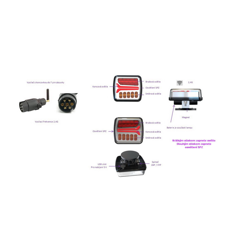2x sdružená aku lampa zadní LED s bezdrátovým připojením k 7pin zástrčce.