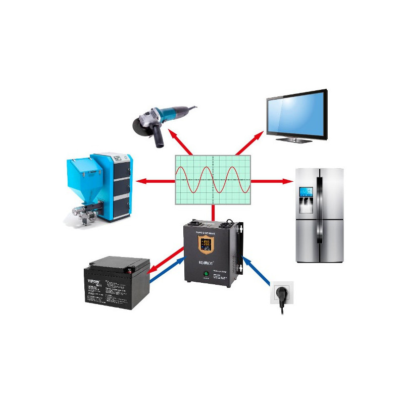► Vzhľadom na čistý sínusový priebeh výstupného napätia (napájanie záťaže) zariadenie poskytuje stabilnú prevádzku bez prehriatia aj pri napájaní indukčných záťaží ako sú čerpadlá alebo ventilátory. Pomocou 12V akumulátora poskytuje kompletné neprerušované napájanie 230 VAC. Obsahuje systém na ochranu akumulátora pred preťažením, skratom, prepätím a prehriatím